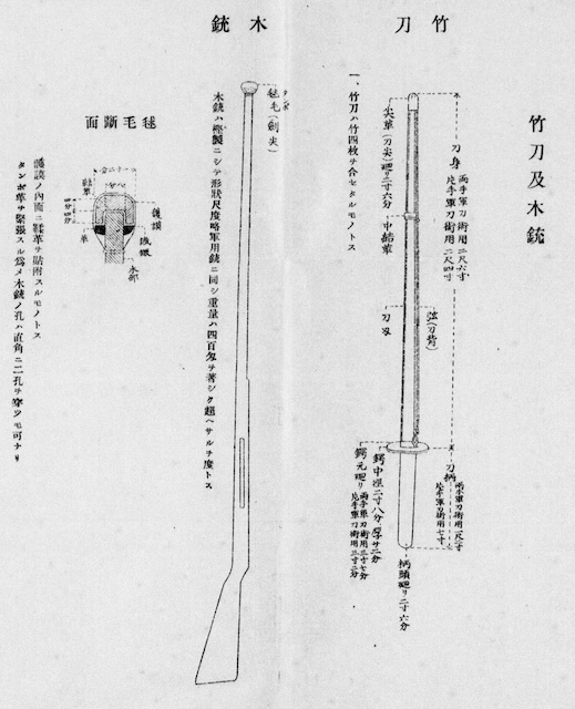 【図4】は、竹刀と木銃を示しているが、竹刀は剣道の練習用。木銃は銃剣術の練習用で、先端に槍に用いる安全具の「たんぽ」が装着されている。