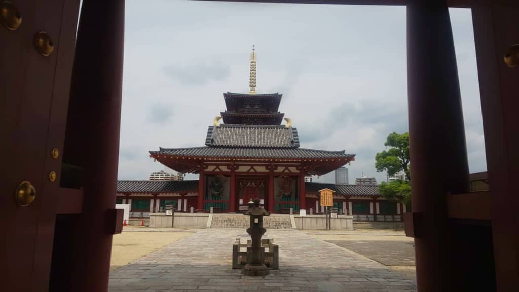 四天王寺伽藍。何度も焼亡したが、毎回再建され、聖徳太子建立の時から伽藍配置は全く変わっていない南北一直線の伽藍が並ぶ。