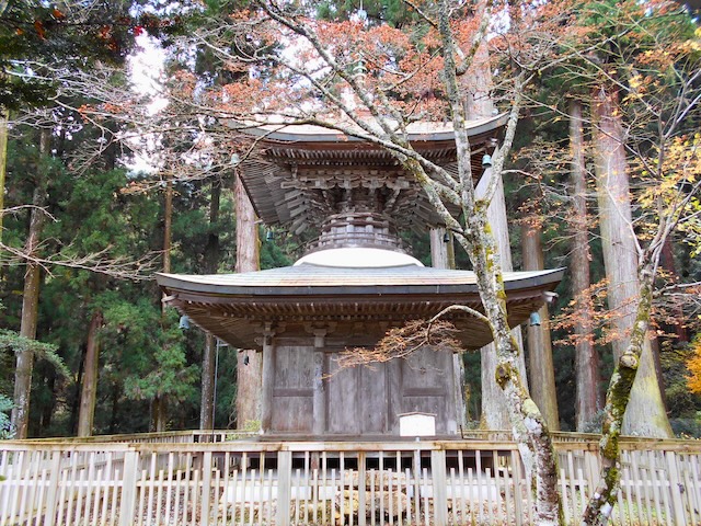 葛城修験の行場の岩湧山中腹にある岩湧寺(いわわきじ)です。重要文化財の多宝塔があります。こちら、最寄りバス停から約5キロ以上の距離があり、もはや最寄りでも何でもないのですがタクシーやマイカーがなければほかに手段がありません。山岳寺院なのだし修行のつもりで歩こうと一番近くまで行けるバスに乗りました(なお、7年ほど前のため、今とバスダイヤが変わっている可能性はあります)。