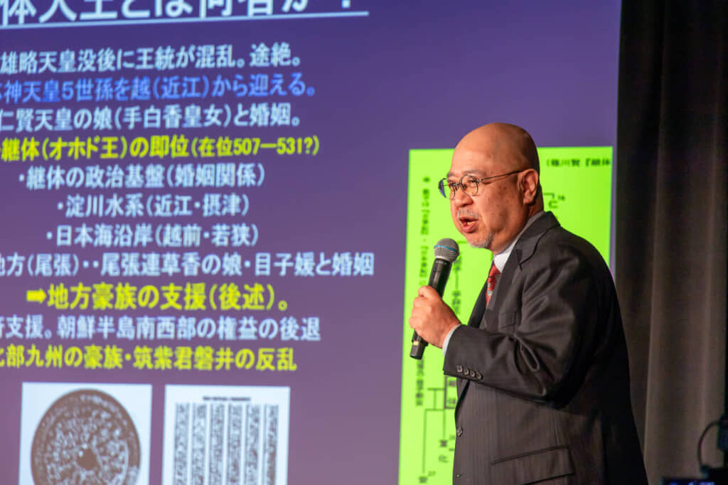 若狭先生は、継体大王の政治基盤について、自身のルーツでもある淀川水系(近江や摂津)や日本海沿岸(越前・若狭)を土台とし、最初の婚姻によって東海地方(尾張)など地方豪族の支援も得ていたことを説明。やがて体制を盤石なものにし、北部九州の豪族・筑紫君磐井の討伐に乗り出し強大な軍事力と権力を示したという生涯に触れた。