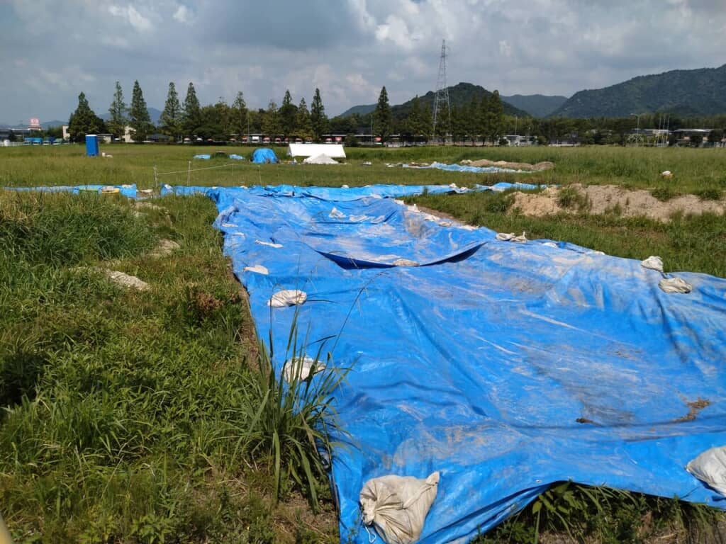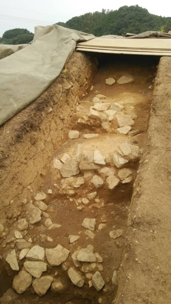 調査をする場所も民間の地権者がいたり建築物が建っていたりするのが普通なので、調査区域は限られます。その貴重な調査区域にトレンチという調査溝を掘ります。もしもその溝壁に土の色の違いや、人工的な石ころ層などが見つかるとビンゴ!となります。古墳の周濠の外周域が発見されたらその古墳の正確な規模がわかりますし、トレンチの壁面や底面に土器や石器が顔を出したら大変な快挙です。