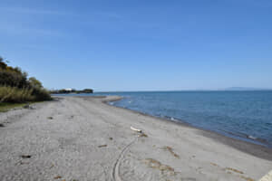 1584年に家久が龍造寺軍と交戦した、沖田畷(長崎県島原市北門町)の古戦場跡と有明海。この戦いで家久は大軍を相手に見事な勝利を収めた。