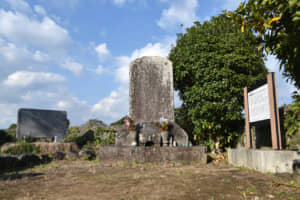 原城跡に立つ板倉重昌墓碑(長崎県南島原市南有馬町)。墓碑は寛政4年(1792)に発生した大災害である島原大変の際に一度失われたが、文政5年(1822)に城下で井戸を掘っていた際に発掘され、現在は原城跡に祀られている。