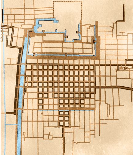 碁盤割とは、市街を碁盤の目のように縦横に直角に交わる街路で区画したものである。名古屋の町人地では、東西11列、南北9列の碁盤割が整備されていた。